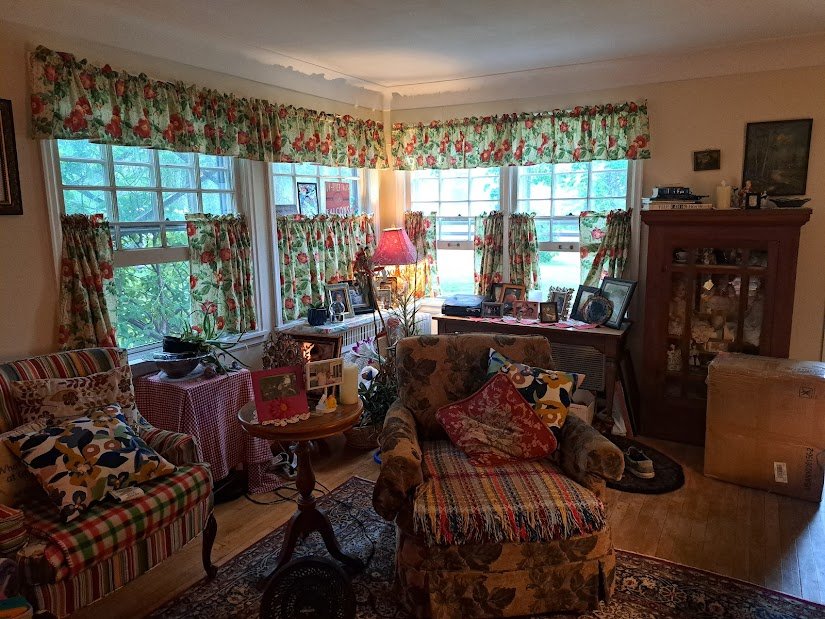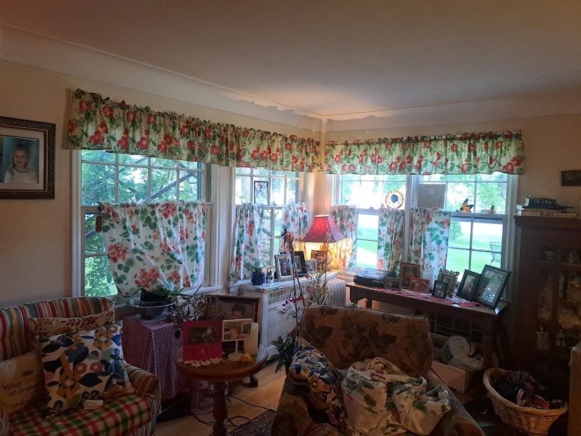 The curtains are done and I love them.  It took about eight hours, which is not so bad.  Here’s a picture of half done, the valances are done here.