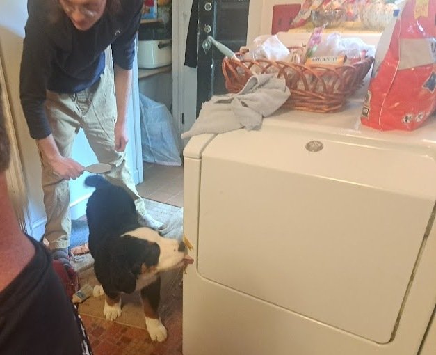 This is how we can brush this wild puppy.   We put peanut butter on the dryer and she cooperates so nicely.