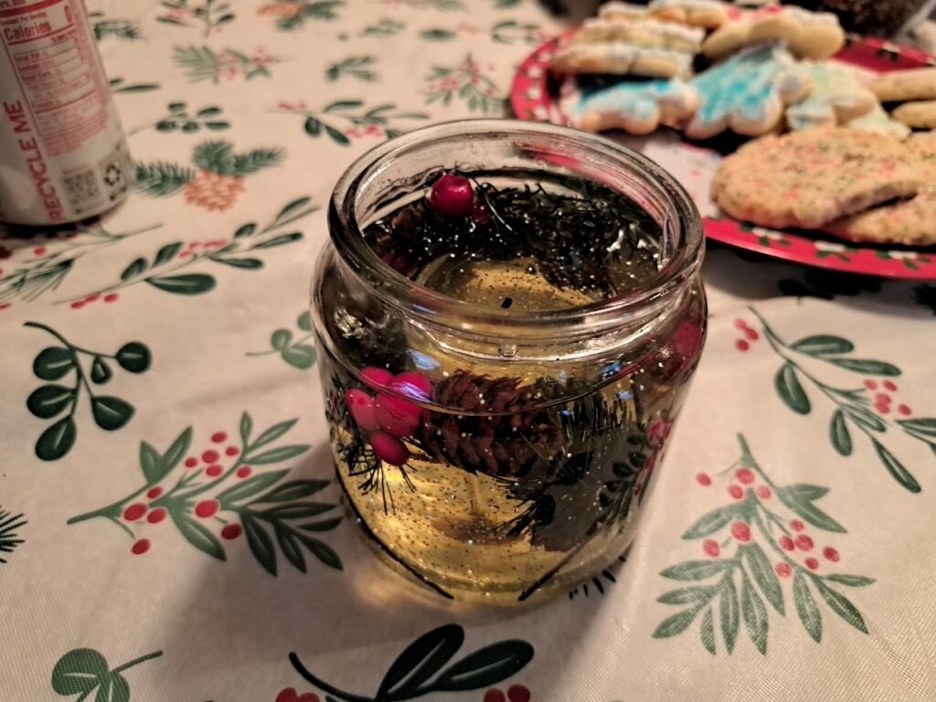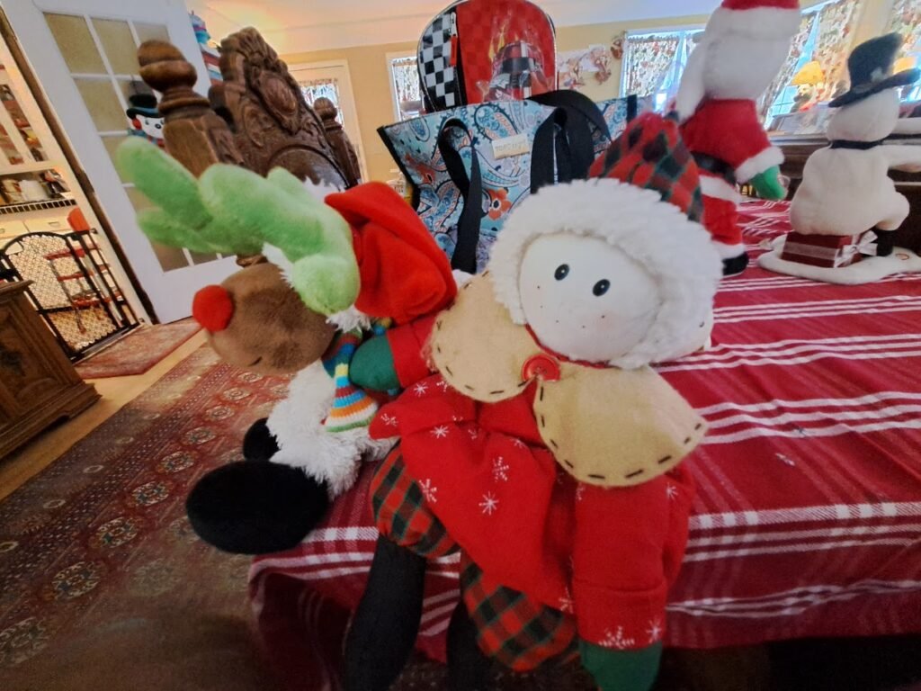Barb made Jello Jigglers, Kari’s favorite. A deer went strolling through the back yard, see it down in the left hand corner–it took me a few seconds to get my camera out. – – – I love Barb’s Christmas decorations, the fancy Santas and cute, fun things everywhere. These guys are always happy to be