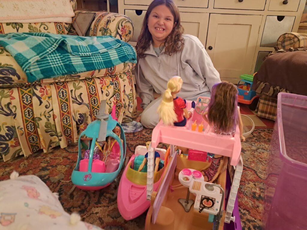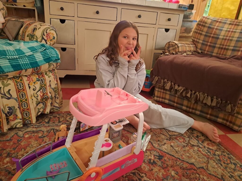 We went out for supper and she got busy opening up the new cabin Barbies. They’re for everyone, new ones for the lake.  We had to figure out where to put all the stickers on the boat, and Joe attached Barbie’s TV.  (Her boat has a TV on it.  That Barbie.)