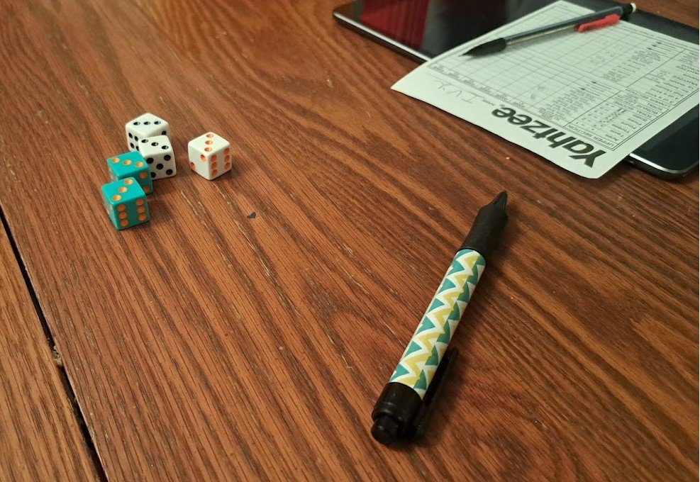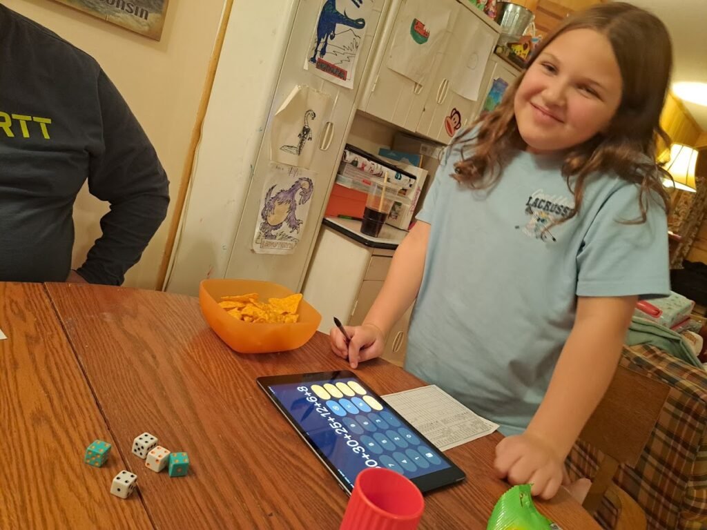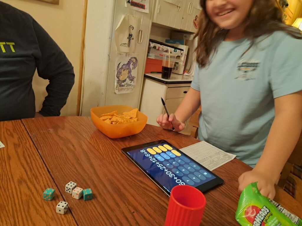 We played Yahtzee. The child had not played before so we had to help her figure out what to do with the dice, which to save and which to roll again, where to put the scores.
