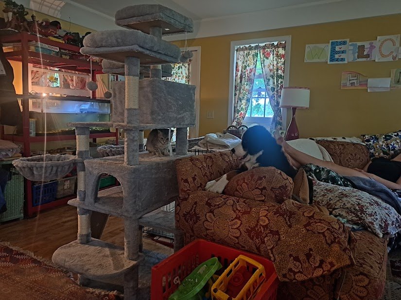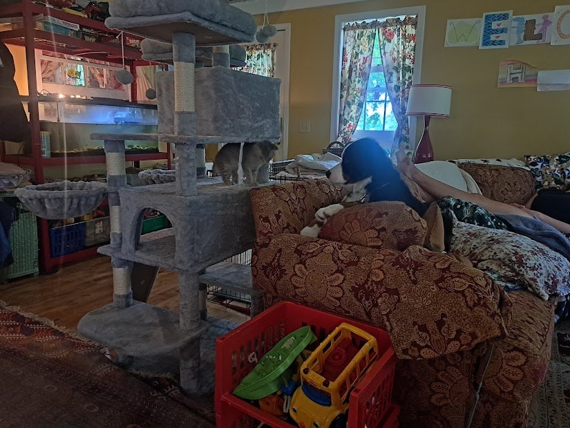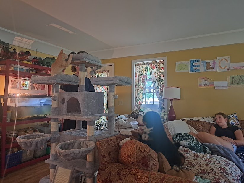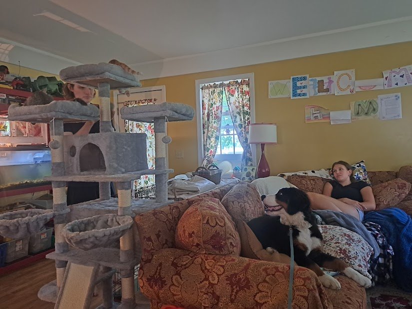 The cats are getting used to the dog and she to them. This cat tower was not easy to assemble, especially by use of the tiny allen wrench they sent, but look at it!