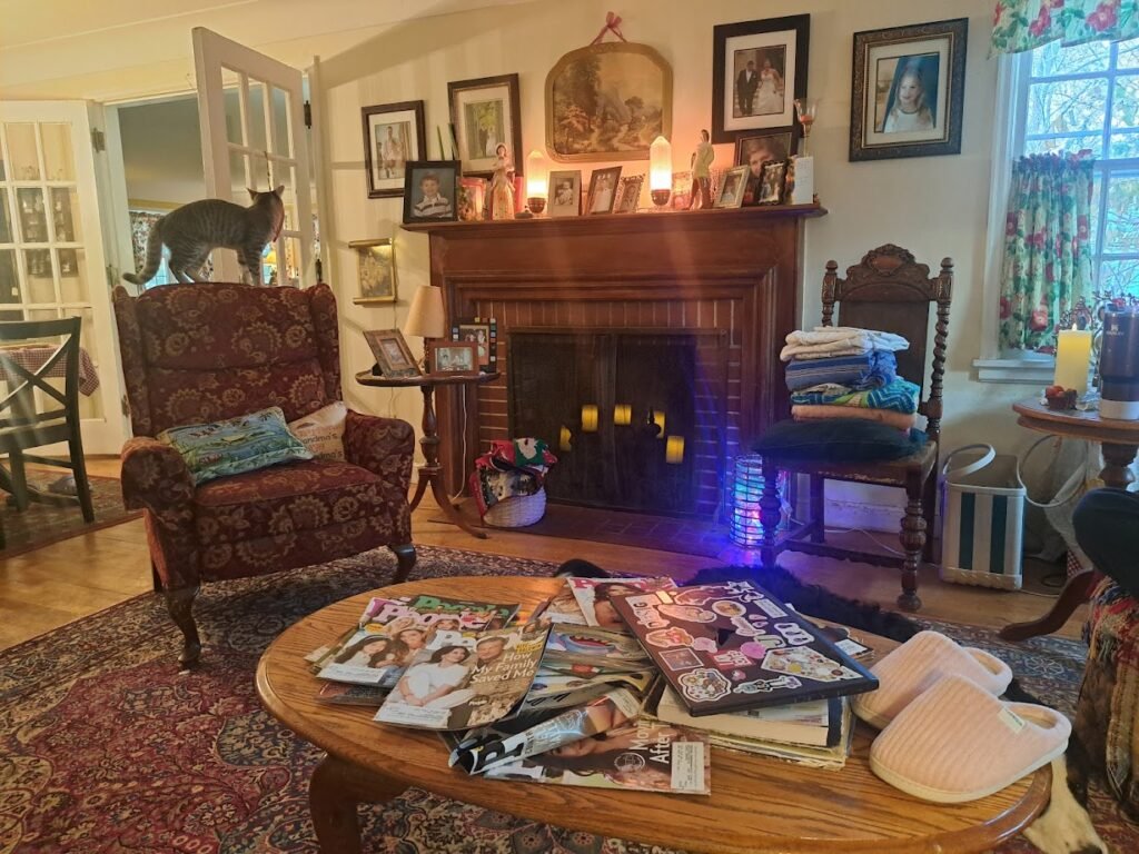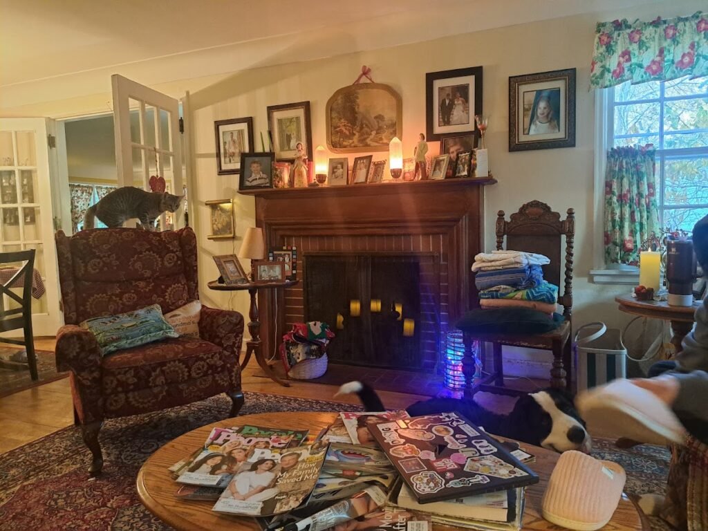 They were on curtain rods in Julia’s room until they destroyed them. Tim knew where some industrial strength rods and brackets were, 1940s ones that came with the house, made of actual steel. Jay brought the drill and we found some little screws to attach them. Hopefully the cats can’t conquer those.