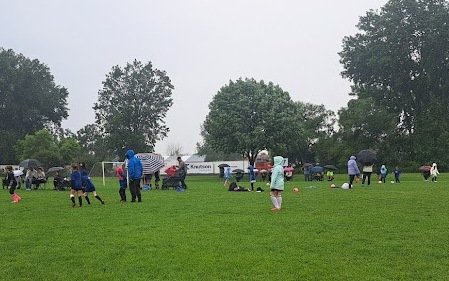It has done nothing but rain, so they stopped cancelling games. That’s our sweet little player in the mint green jacket, playing in a downpour. Good grief.