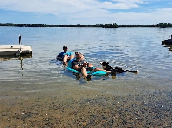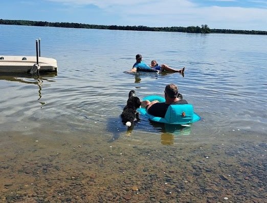 The dog swam out to them, and they pulled her up onto the mat.
